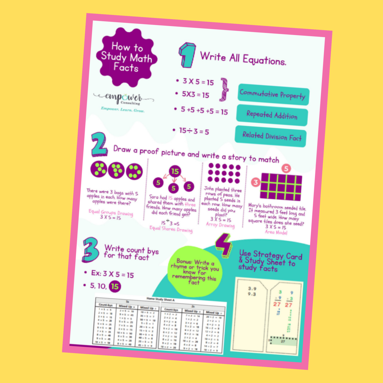 For students in grades 3-5, use this sheet to help practice unknown facts. Stick to one sub-fact (like 5s) and see which multiplication and division facts they don't know. Apply these four steps to those unknown facts.